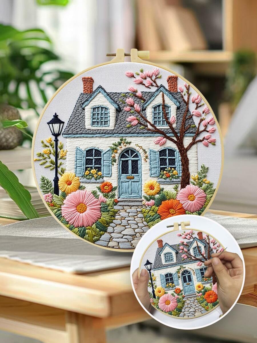1 Pieza Kit de Bordado, 20x20cm/7.9x7.9in, Kit de Bordado DIY para Flores y Casas, Patrones Hechos a Mano, Adecuado para Principiantes Adultos, Incluye Tela de Bordado, Manual de Usuario, Agujas de Bordado e Hilos, Regalos de Navidad para Amigos o Familia, Muebles, Obras de Arte Hechas a Mano para Oficina