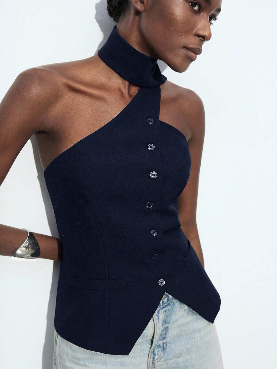 Maija 2025 Otoño/Invierno Chaleco asimétrico de cuello halter en azul marino para mujer, con la cintura ceñida y ajuste delgado, moderno, elegante y versátil para uso diario, casual, romántico, apropiado para fiestas de Navidad, Año Nuevo, Acción de Gracias, vacaciones en la playa, graduación, bodas, citas, fiestas, conciertos, brunch, aeropuerto y otros eventos