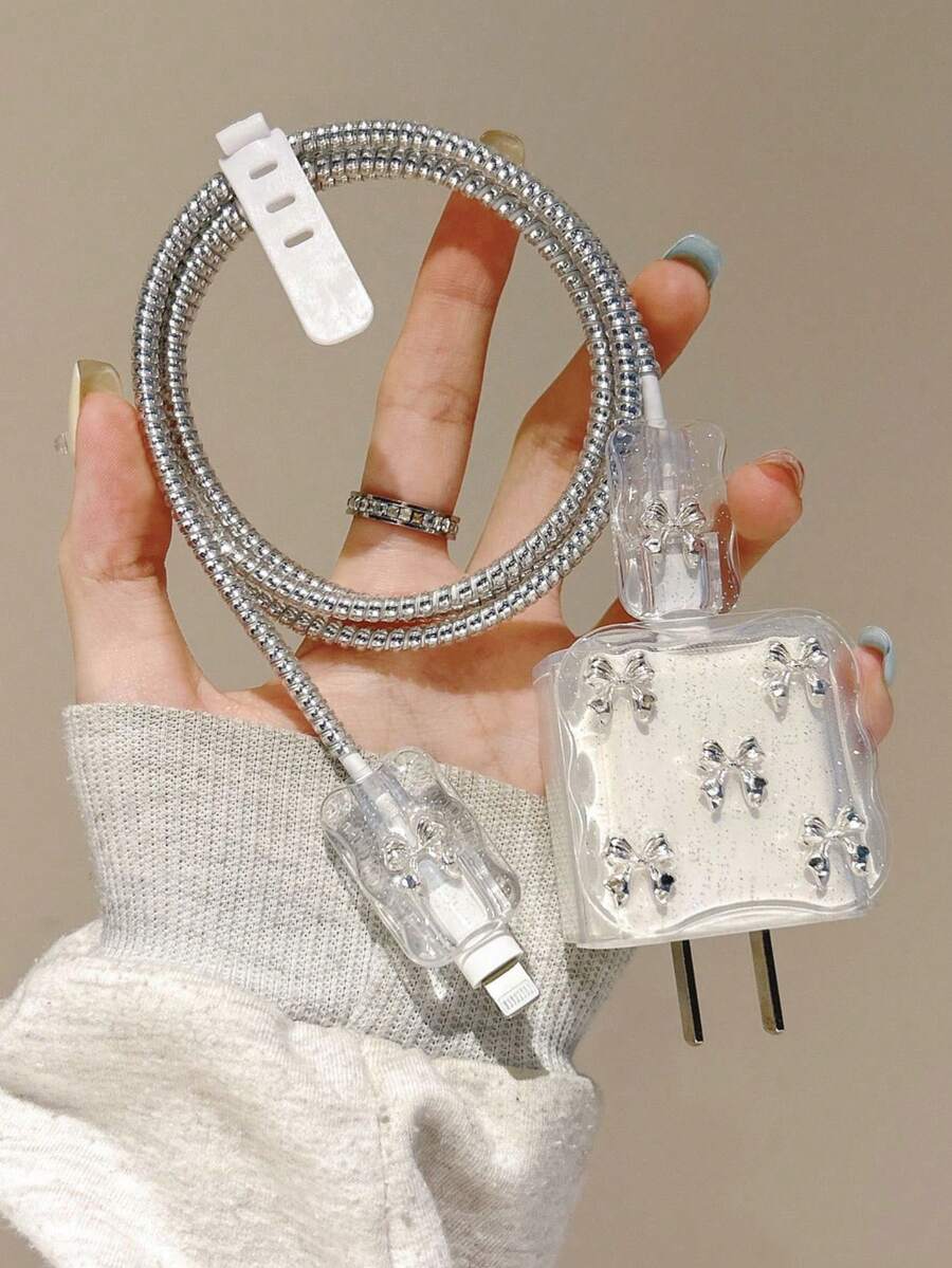Set de 5 piezas de accesorios de carga para teléfono móvil, incluye: 20W/18W Cable protector y cargador de metal con diseños de arco y olas, protector de cable de carga, protector de carcasa para cabezal de carga, compatible con cable de cargador de