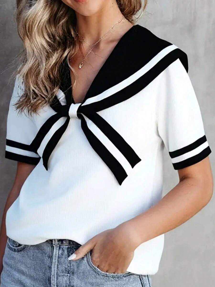 Suéter de cuello marinero de punto talla grande para mujer, elegante y de moda, jersey informal de manga corta