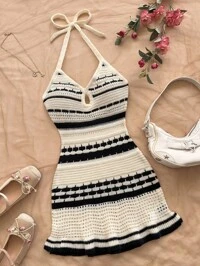 Soleia Vestido mini de punto con textura de tela con conchas marinas para mujer, atuendo sexy para fiesta, cita, playa y vacaciones de verano, adecuado para citas de vacaciones, té de la tarde, temporada de bodas, crucero de playa, viaje por carretera urbano, vacaciones bohemias, festival de música Vestido de punto para mujer, Otoño/Invierno 2025, Elegante, Digno, Informal, Grácil, Cuello en V, Manga larga, Liviano, Apropiado para ceremonia de graduación, Vuelta al colegio, Navidad, Año Nuevo