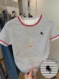 Siren GazeAttitoon Mono de cuello de polo con gráfico de logo pequeño de caballo en estilo minimalista casual, adecuado para otoño/invierno, estilo versátil, vintage, universitario, sexy, lindo, Y2K, chica de coco, bohemio, hippie, festival de música