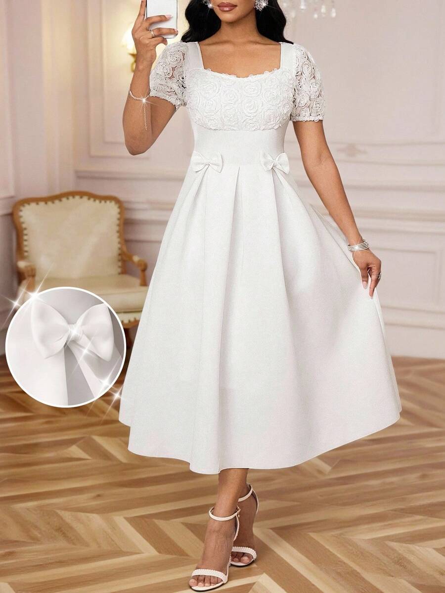 SHEIN Lady Vestido de manga corta con cintura ceñida, decoración de lazo 3D y estampado de rosas blancas