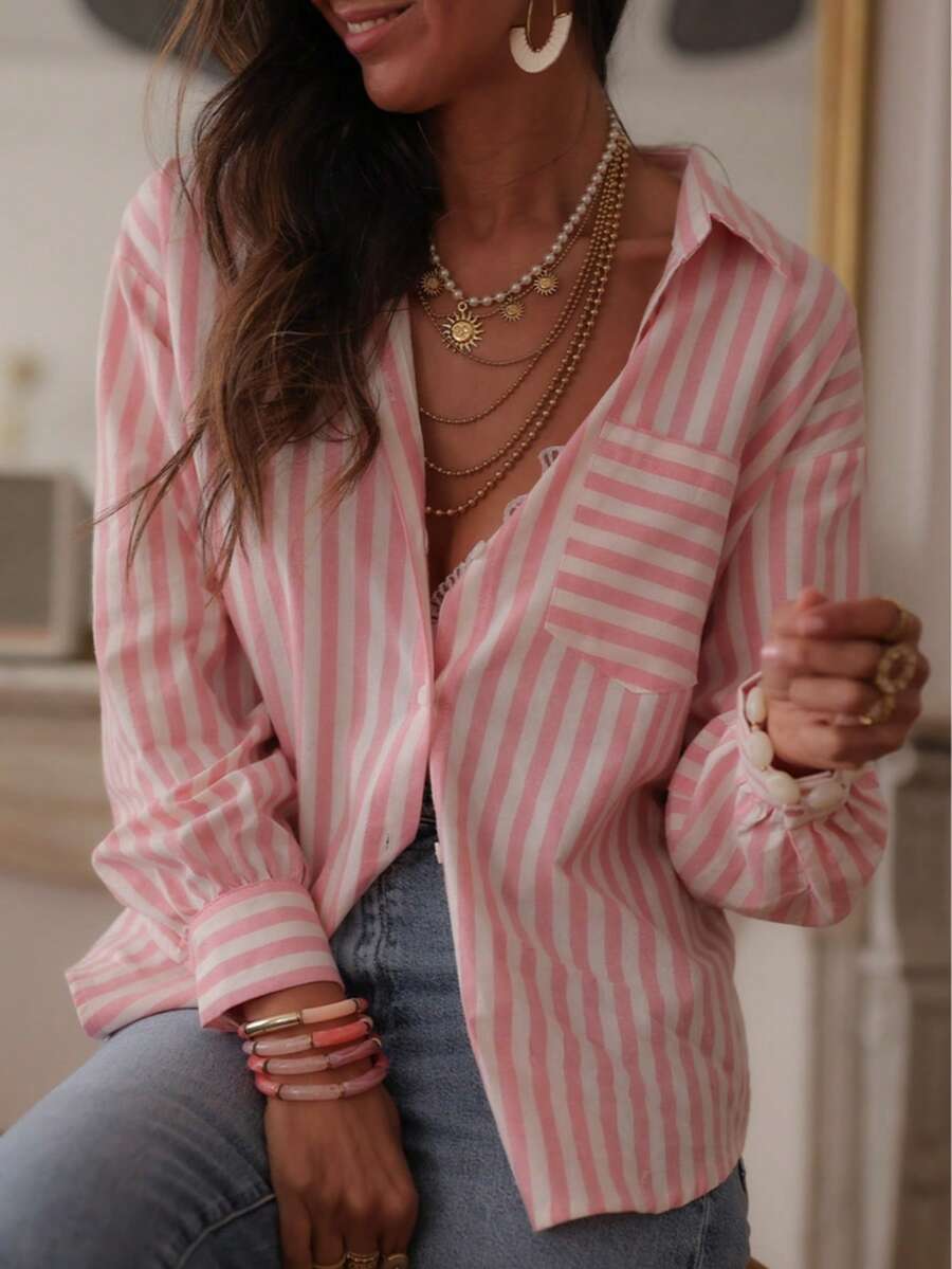 Camisa de mujer de manga larga a rayas de color rosa claro con botones