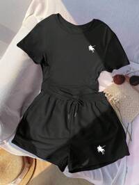 SoleiaSHEIN x Eduarda Gutierrez Soleia Conjunto de 2 piezas para mujer con top corto de punto a rayas y shorts ajustados de tiro súper bajo, atuendo adecuado para vacaciones, fiestas, Navidad, San Valentín, citas, playa, crucero, carnaval, Pascua, Año Nuevo Chino