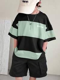 ZikoriSHEIN Set de 2 piezas para niños pequeños con estilo deportivo coreano informal: top de tirantes estampado y pantalones cortos cargo de color contrastante, adecuado para sudadera con capucha, sudadera con cremallera, ropa de niños, conjuntos de niños, ropa de niño, escuela, vuelta al cole, uso diario, viajes, deportes, temporada de primavera/verano