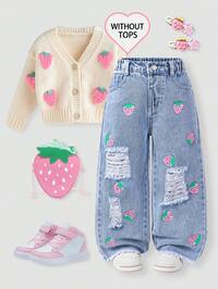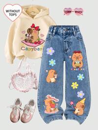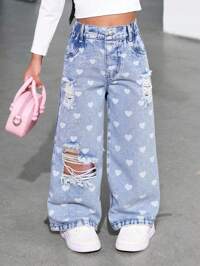 ChillGRLSHEIN Jeans para niñas, azul lavado medio, estilo callejero casual de vacaciones, diseño Y2K, cintura elástica asimétrica, bolsillos básicos, decoración con botón a presión, adorno de rhinestone, pierna recta suelta, denim de algodón suave, sin estiramiento, adecuado para uso diario, ir y venir, salir, fiesta, nueva llegada de otoño/invierno