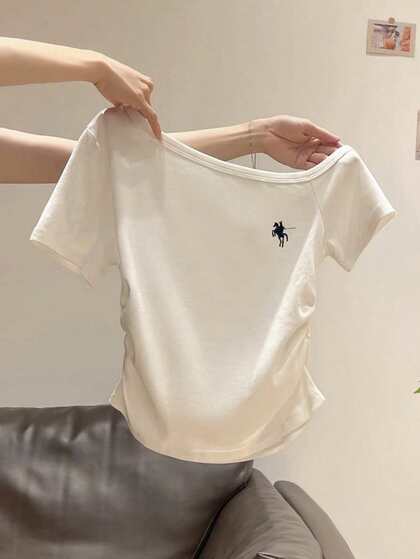 Airaco Camiseta de mujer con cuello asimétrico, manga corta y bordado de color contrastante